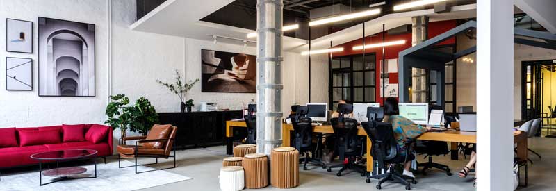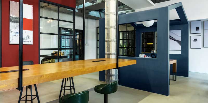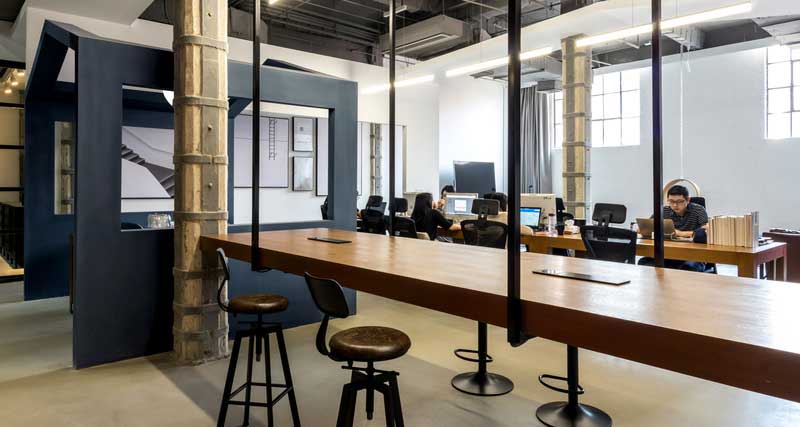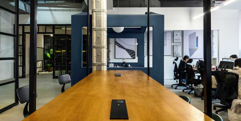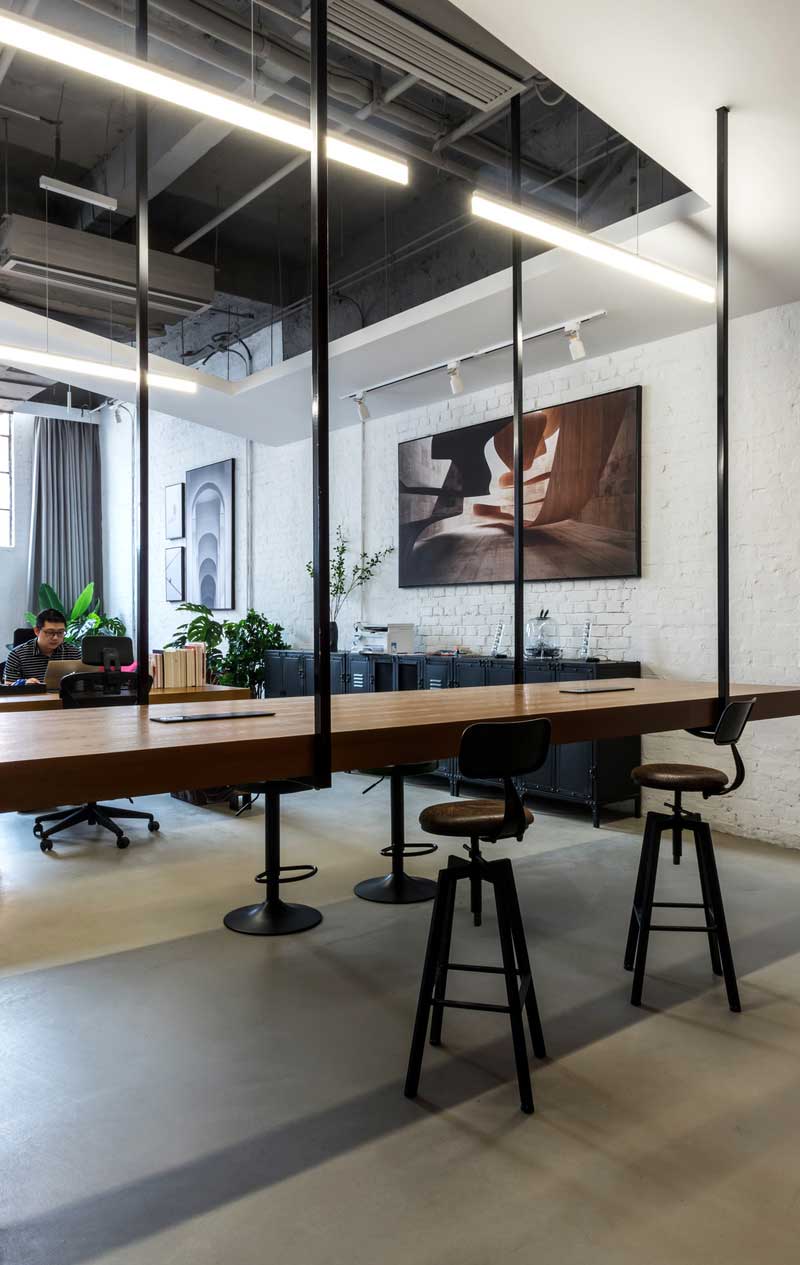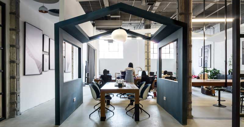這里沒有冰冷刻板的接待臺和問詢處,取而代之的是平等開放的辦公區和家一樣的共享休息區。設計師尊重原有建筑物的特點,來做了整個空間的布局。利用了屋中屋的方式,讓整個空間有獨立的功能,又隔而不斷。主要的材料就是石膏板和玻璃隔斷隔墻,低碳又經濟。