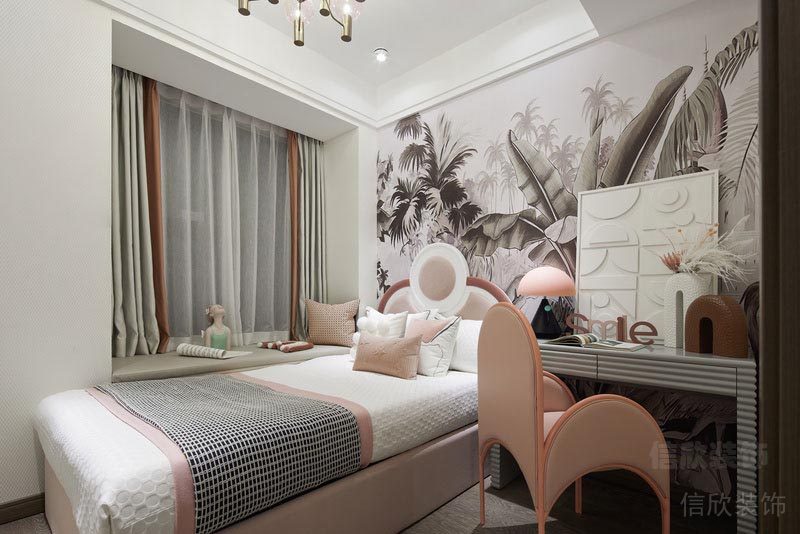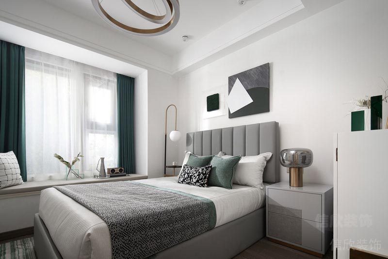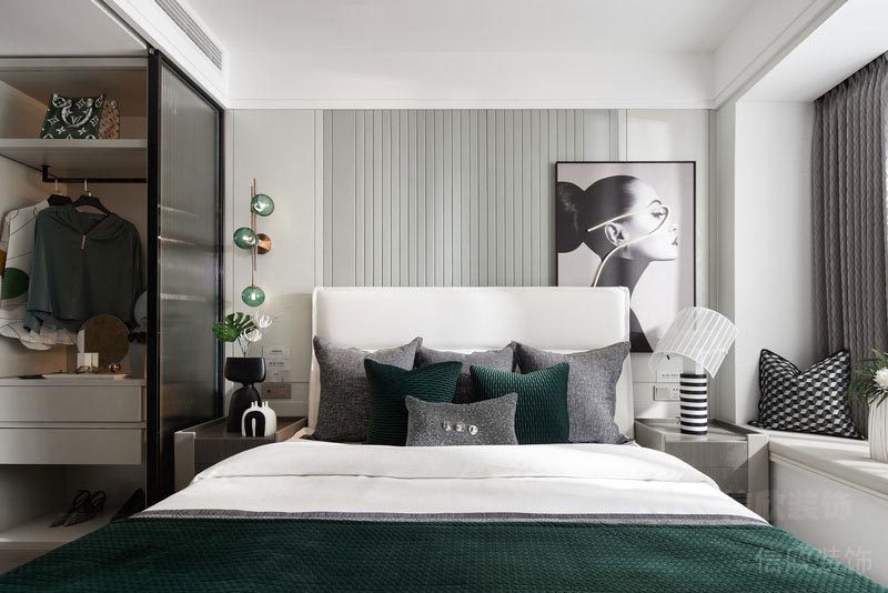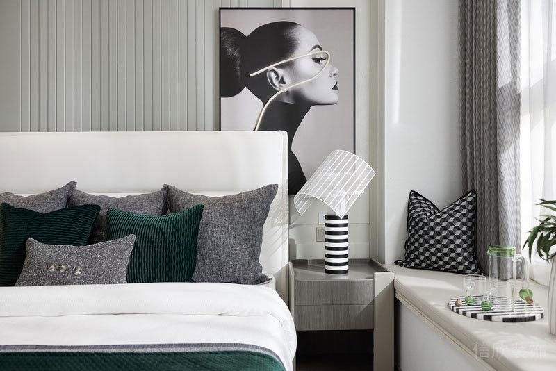 臥室的設計延續(xù)客餐廳的舒適與品質感,摒棄一切繁復冗雜的擺設,用簡潔明了的語言展現(xiàn)出生活的質感,錯落有致的陳設細節(jié)與個性的掛畫使整個房間有一份冷靜和內斂,打造了一個年輕時尚的都會空間。