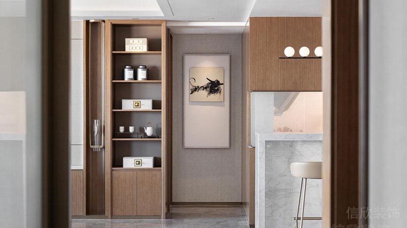 茶桌背景墻上懸掛的抽象畫以傳統的孺子牛為原型,以流動的和黃棕顏色的塊面展現,與井然有序的空間格局形成反差,寓意刪繁就簡,去除太多不必要的造作偽飾。內在返璞歸真,清新寫意。