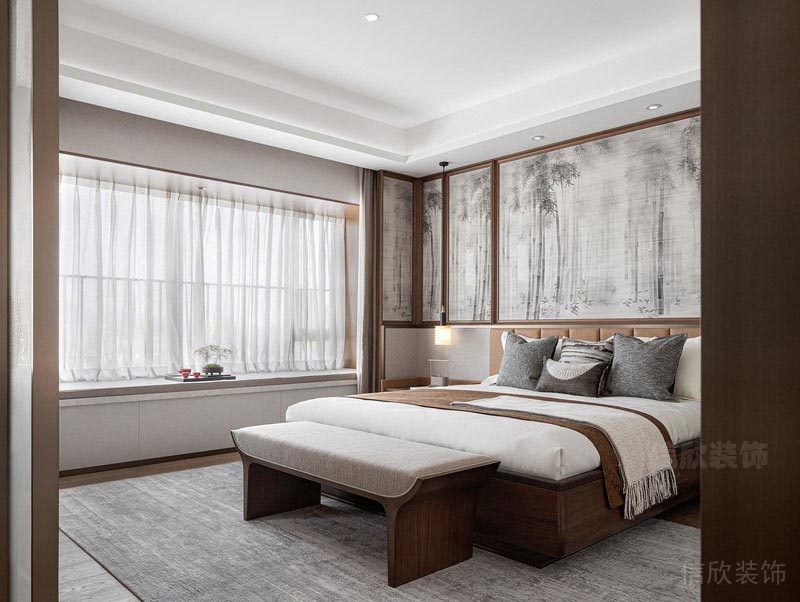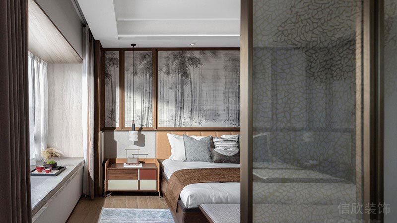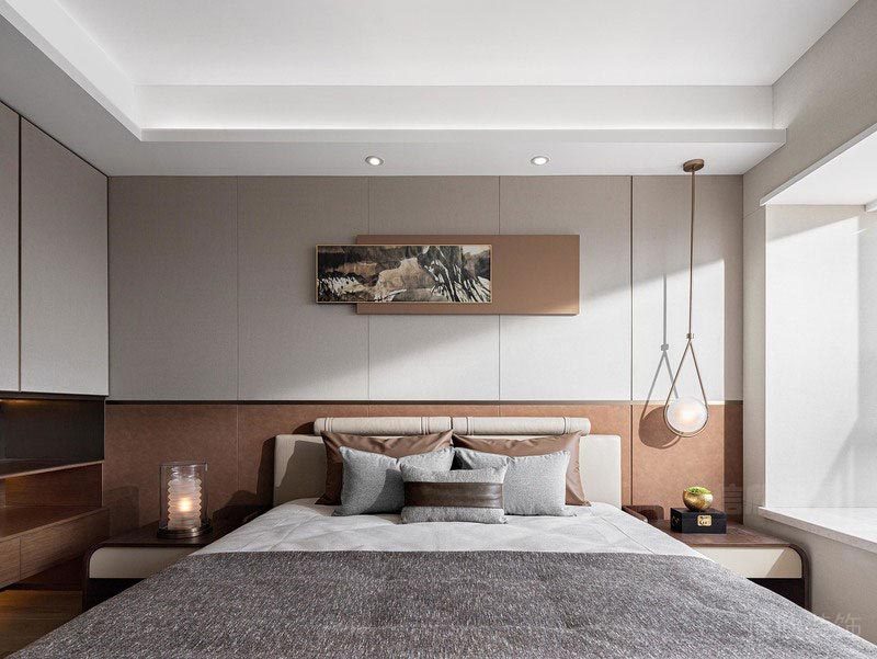 次臥的設計減少了動態線條的運用。以大量天然材質和對稱的幾何形態構成空間,并放大了空間的采光設計,通過軟硬裝的整體配合營造時尚而溫馨的居室樣貌,整體敞亮而舒適,營造出更多高級質感及溫馨的居住體驗。