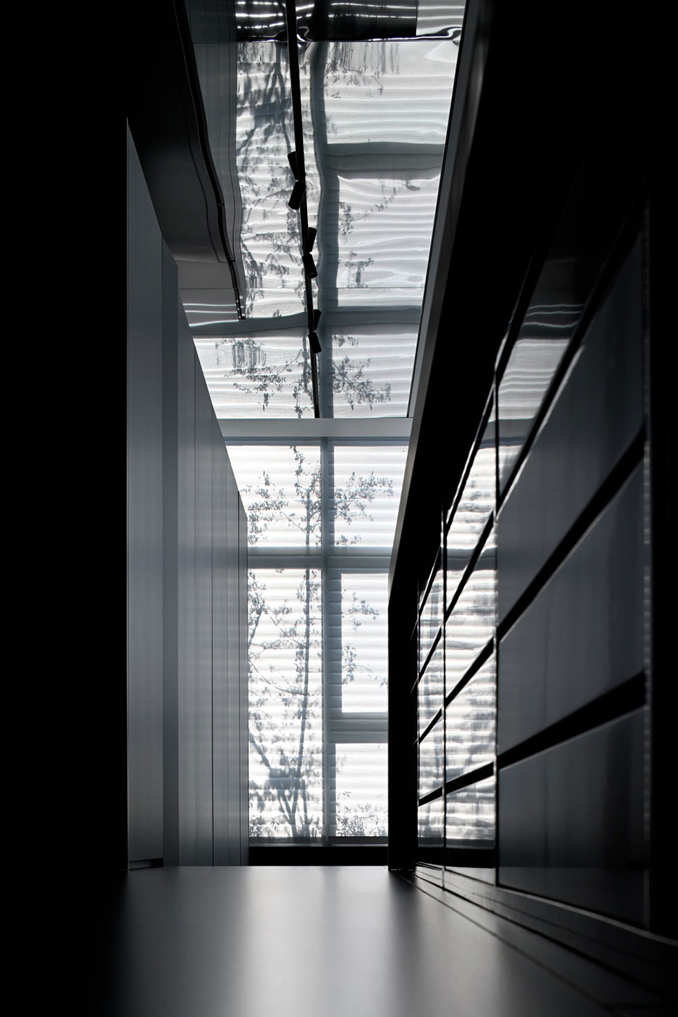 在天花板及過道中懸掛黑色金屬燈飾,采用直線式設計,突出簡約的美學,提升空間的時尚感。