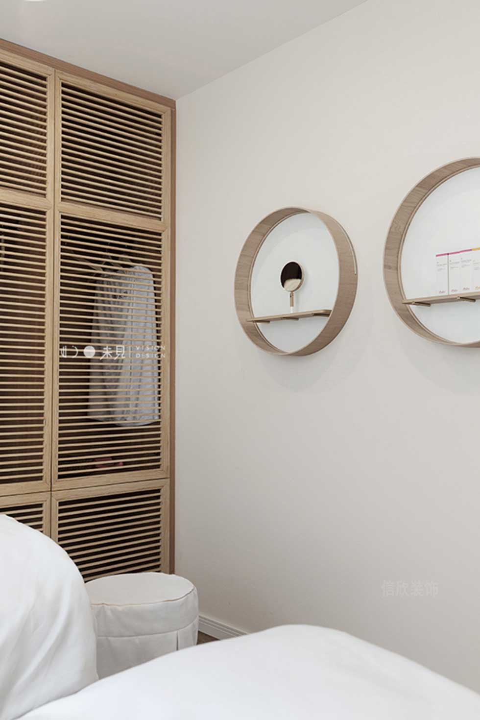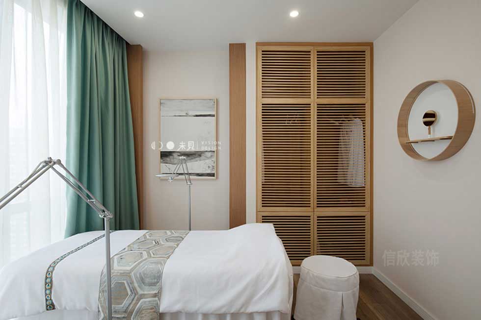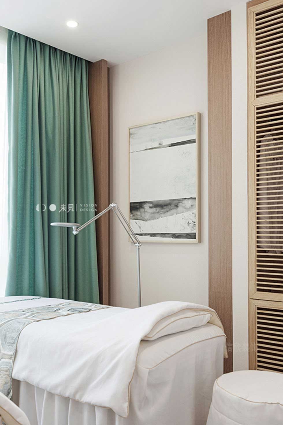 美容室的裝修設計,白色的墻頂面,原木色的地面,用自然和原始的氣息,營造出溫馨和放松的環(huán)境,綠色的窗簾的點綴,仿佛把清風般的綠意,直接吹進人們的心扉。
