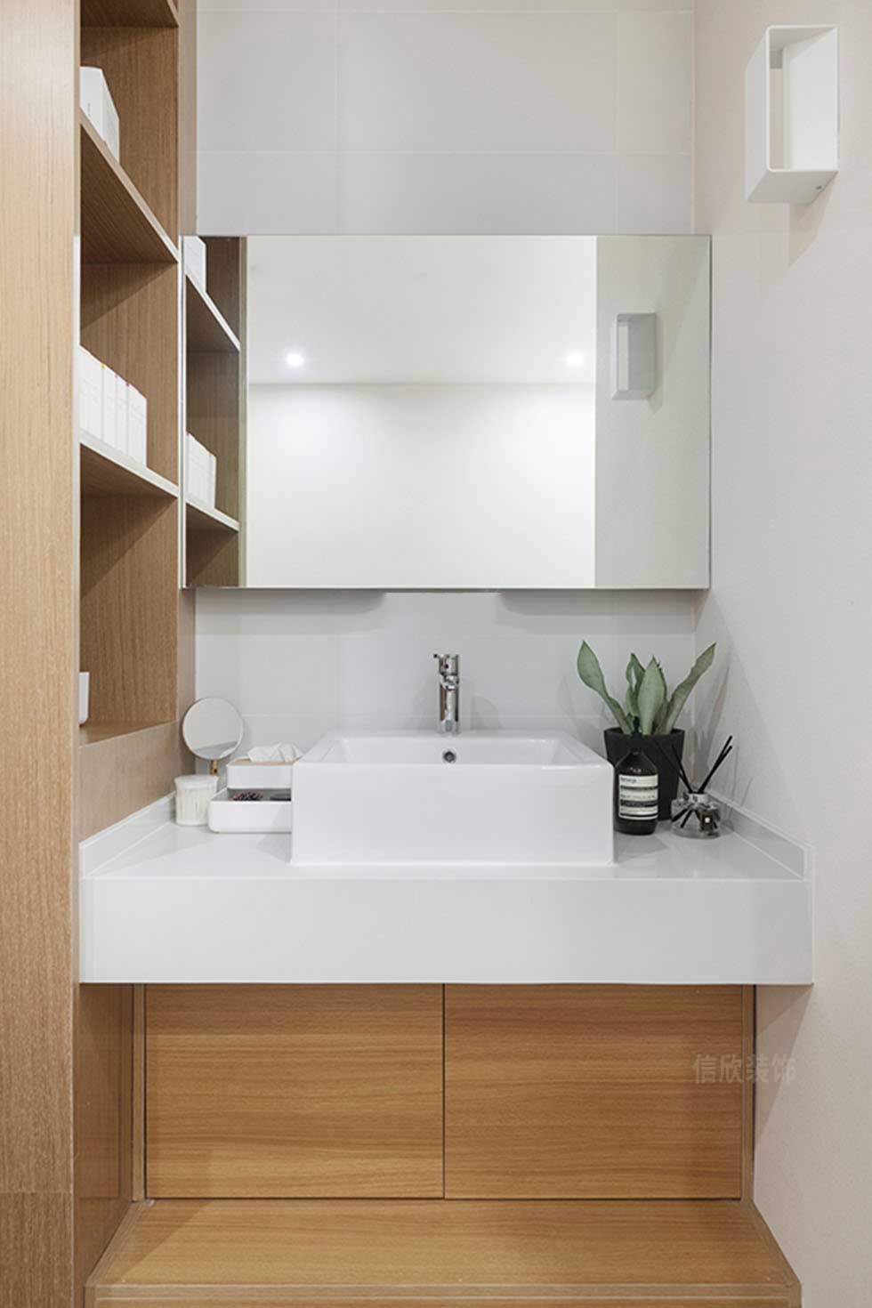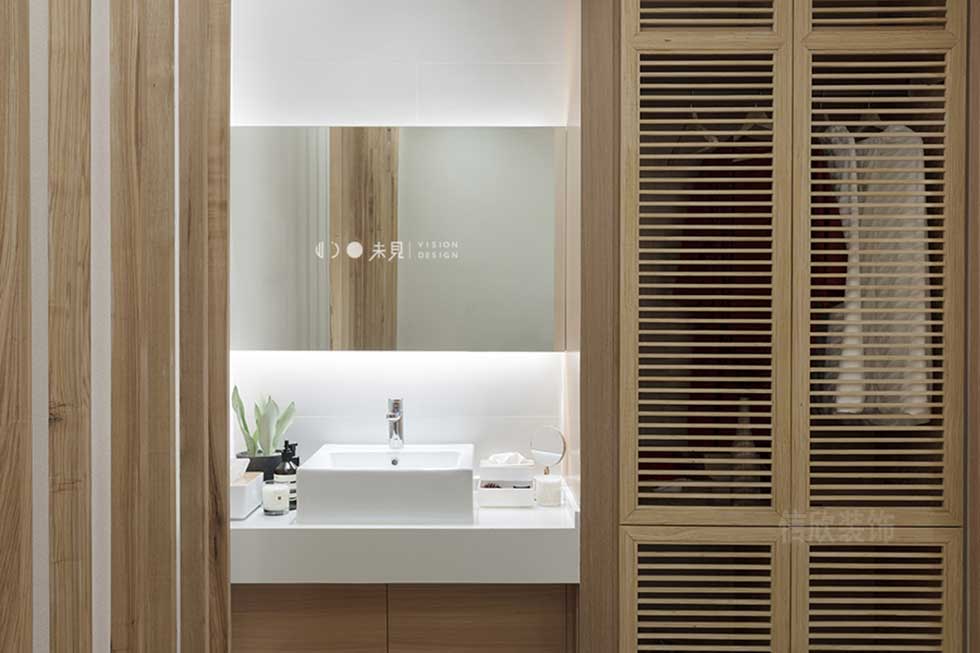 隱藏式的洗手臺設計和百葉門衣柜一體式的設計,功能性強,且美觀大方,把原木色北歐式手工藝的美感發(fā)揮的淋漓盡致,賦予了自然的生命力。