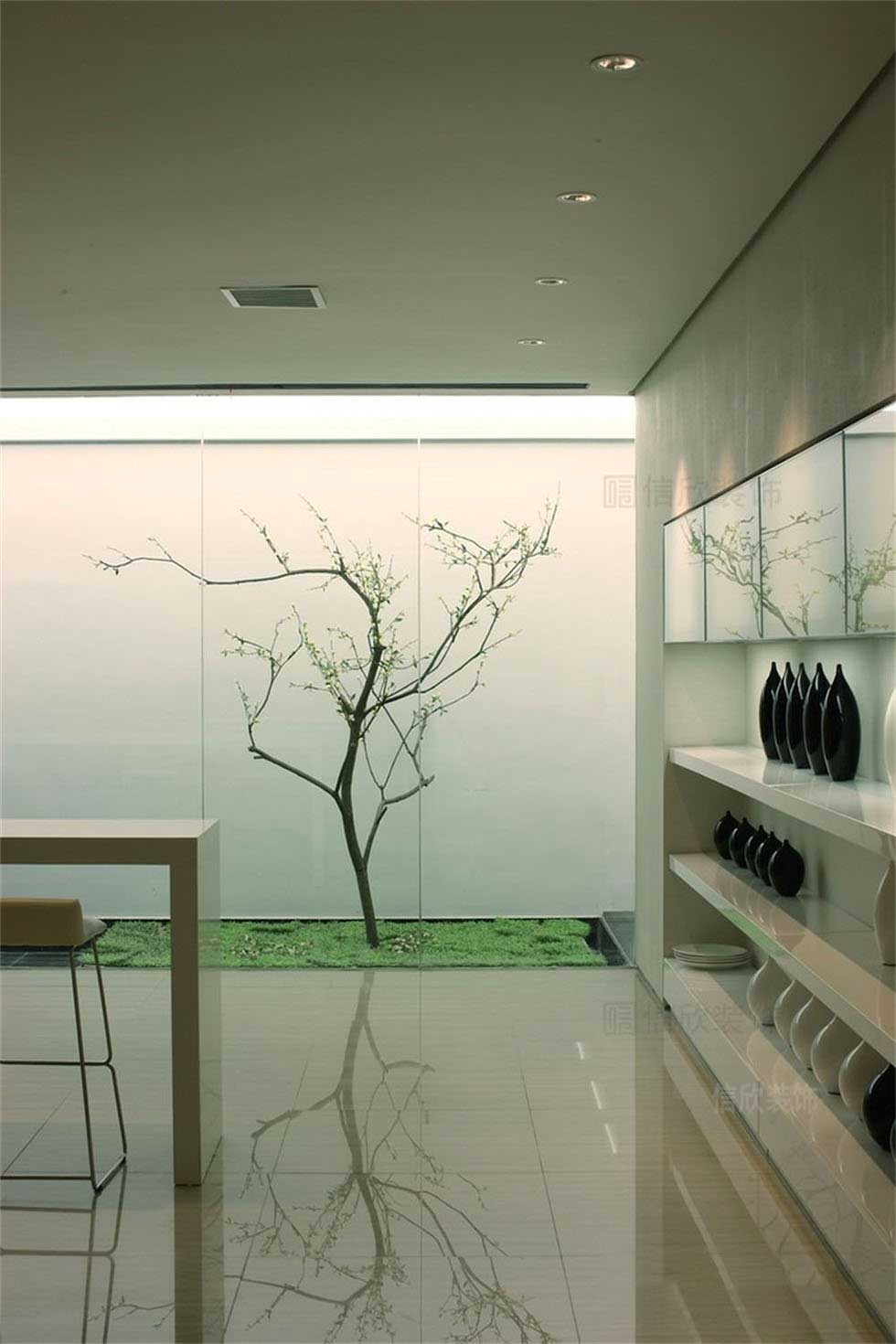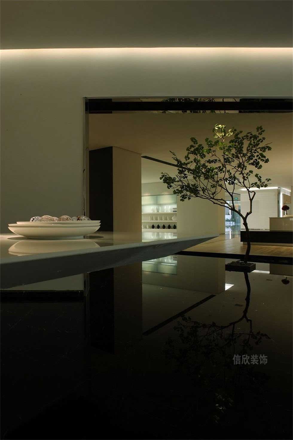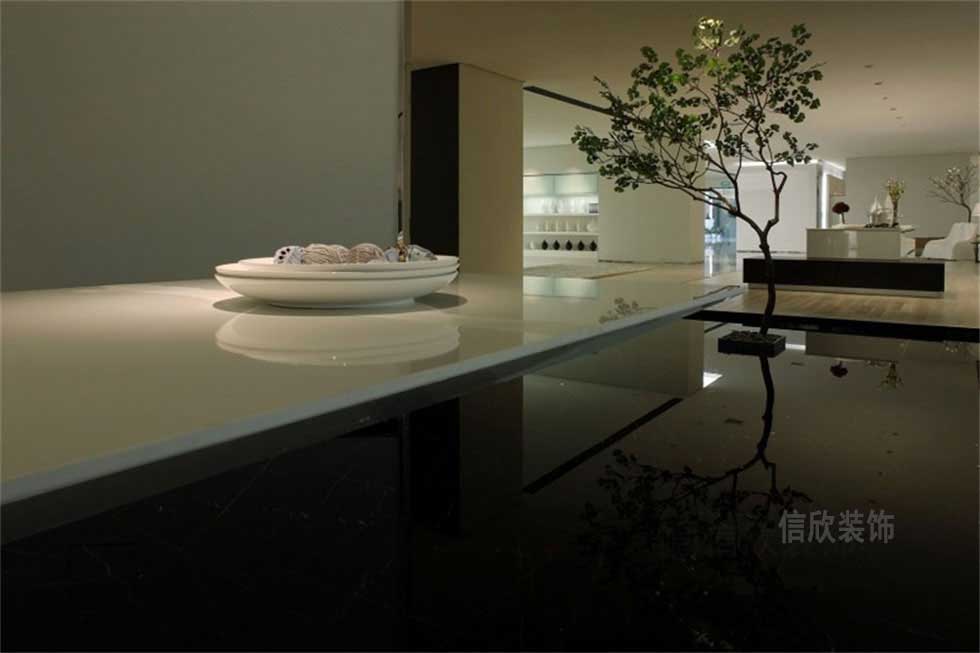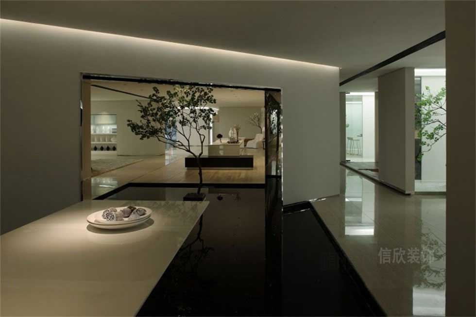 黑色的地磚作為區域的劃分,下降的地臺做法,搭配盆景的設計,在房間里營造出枯山水的精致,高拋的黑色地磚,高光的反射度,讓人沉醉于亦真亦幻的夢境里。
