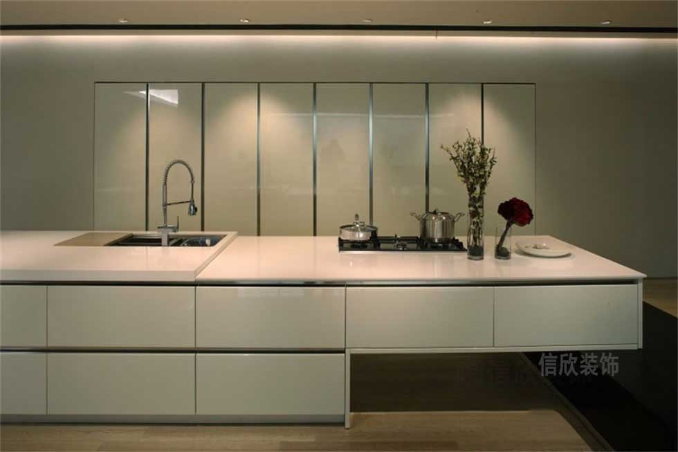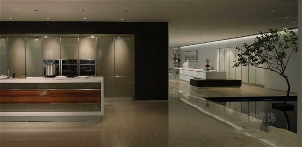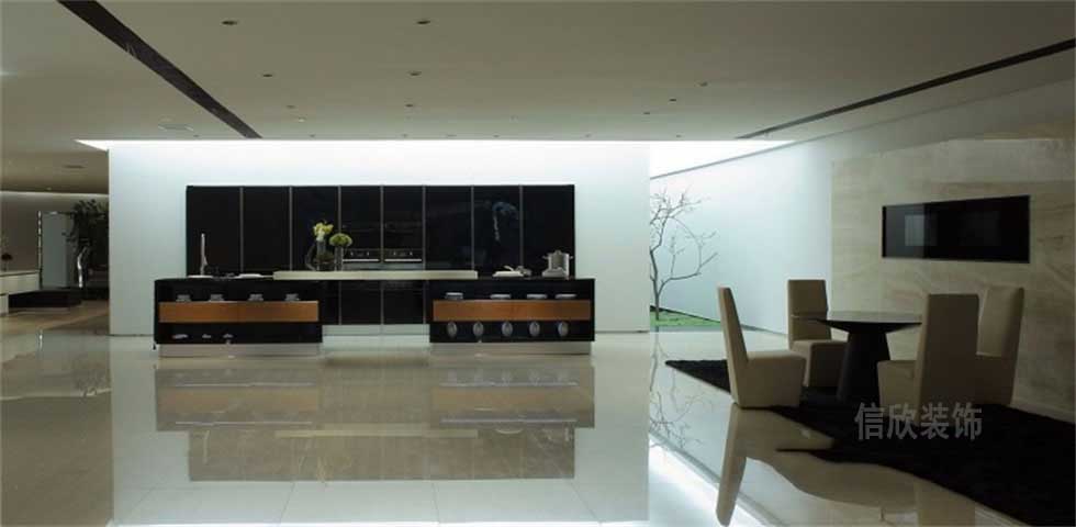 素雅的米色地面,符合現代人的審美特點,玻璃材質的壁柜,簡約中富有時尚高檔的氣質,黑色和白色結合的中島柜,兩邊做碗筷柜,中空隔板早餐臺的設計模式,新穎使用功能性強。