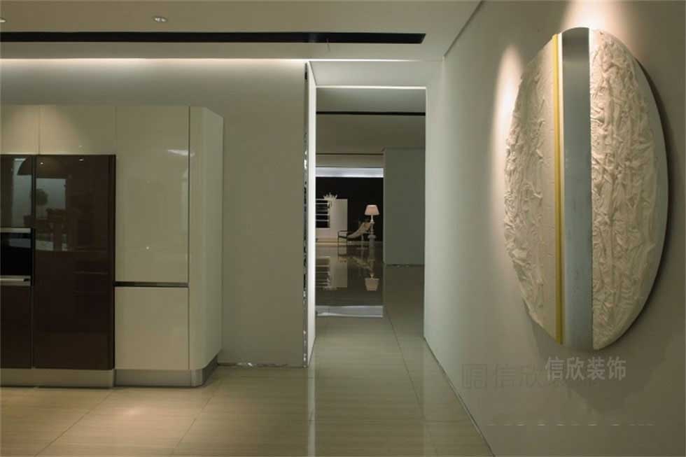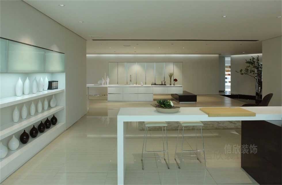 開放式的廚房設計,白色簡約的曲線式設計,線條感十足,營造出一份從屬于現代簡約廚房,典雅的高端氣質,搭配早餐臺的設計,強化了使用的功能性和空間感。