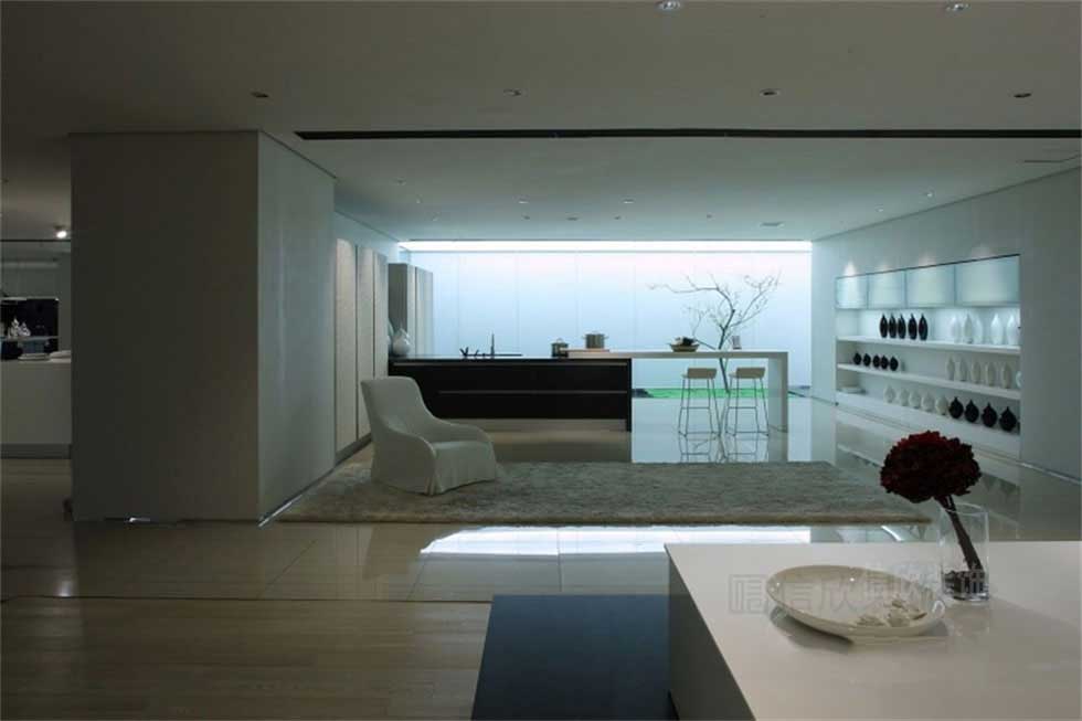 淺色原木風的木地板,搭配白色調的整體空間,地毯的巧妙應用,增添了一份只屬于家的溫馨感覺,黑白的中島臺可做為一見藝術擺件,也能作為燭光晚餐和早餐臺來使用。