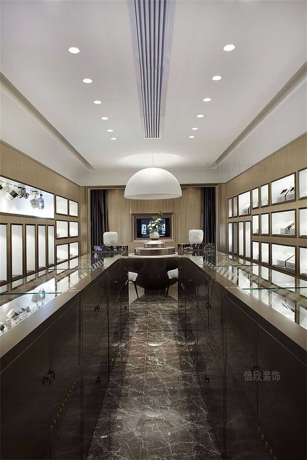 墻面的金屬玻璃展柜,和地面自然紋理地磚相呼應的玻璃矮柜,顏色的對比上非常接近,在暖黃色的燈光照射下,深色的空間給人一種珠寶店般的輕奢感覺,不經意間展現奢華。