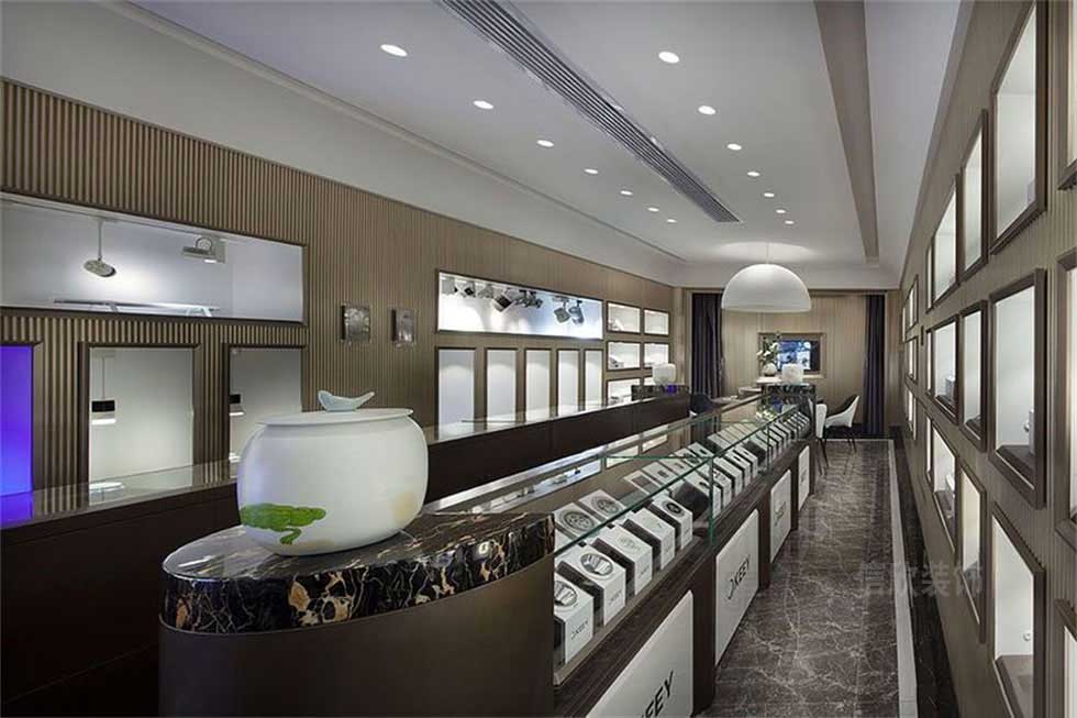 門面的裝修設計,采取現代理念的設計,中間開設正門上置品牌LOGO,兩邊是立體如鉆石般切面的玻璃展柜,形狀獨特光線明亮,給人一種如寶石般璀璨的閃爍亮眼的感覺。