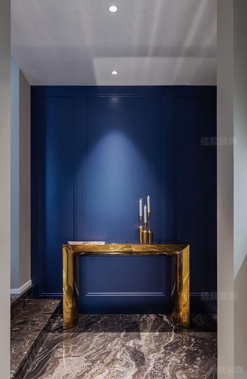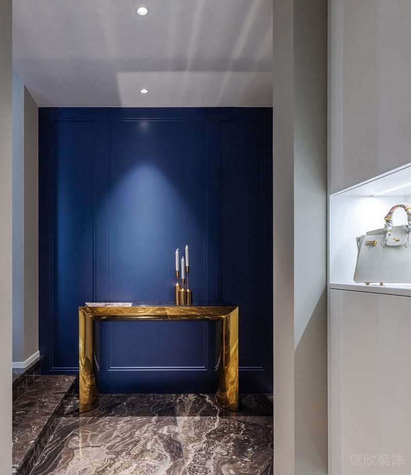 深圳市福田區綠景紅樹灣壹號玄關 本案的玄關,選用杏色的壁紙作為墻面的基調,配上歐美貴族式的藍色在背景墻色調,金色金屬和天然石材的玄關柜把奢華感拉到了極致。