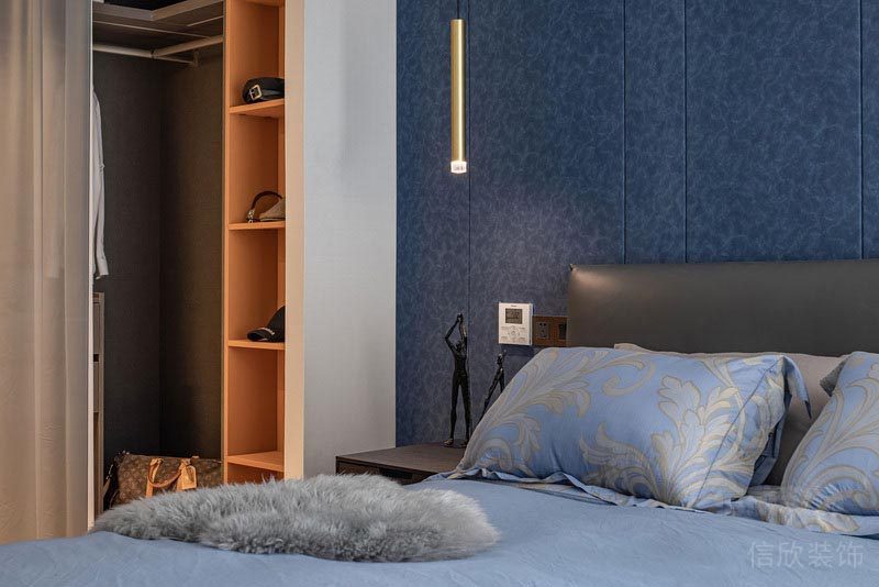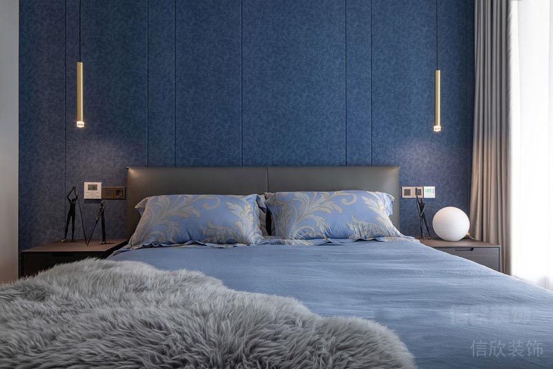 深圳市福田區綠景紅樹灣壹號主臥 主臥室的設計采用了皮藝的床,和藍色斑點的硬包背景墻,配上代表輕奢風的金屬長管式吊燈,協調,溫馨中多了一份與眾不同的氣質。