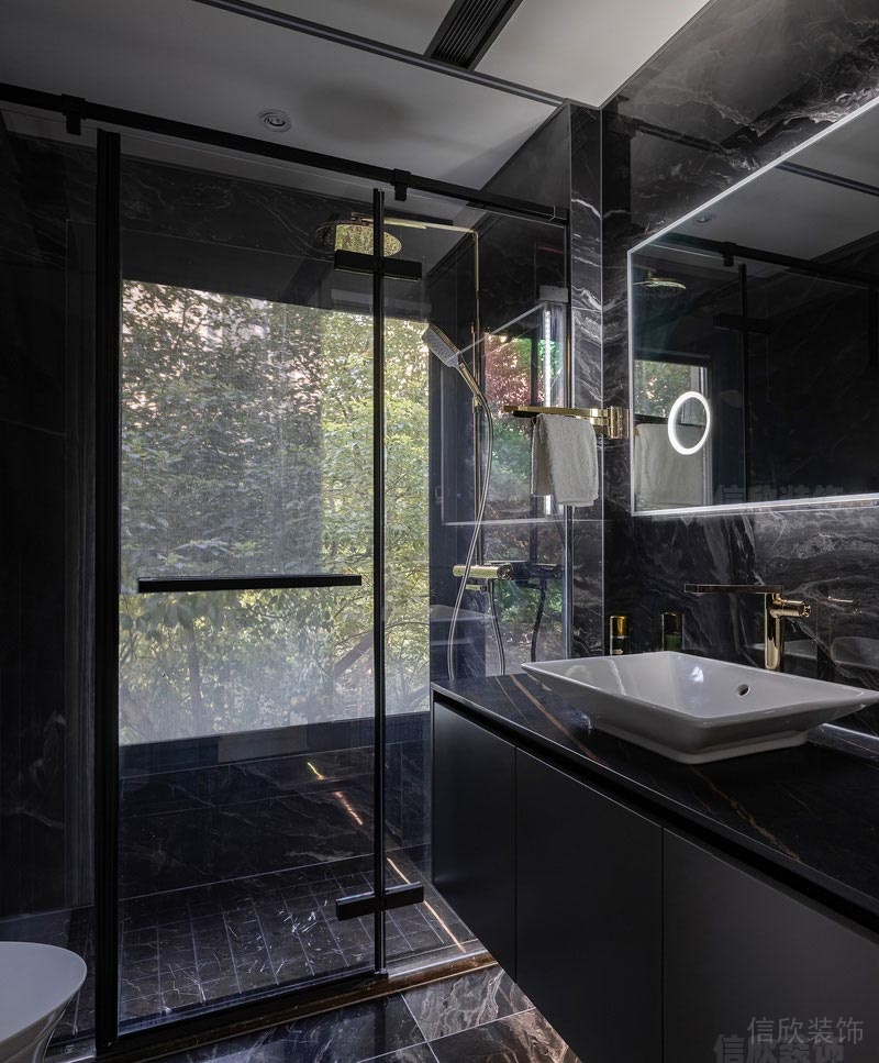 深圳市福田區綠景紅樹灣壹號衛生間 黑色紋理的墻地磚,同樣黑色的浴室柜,加玻璃做了干濕分離的衛生間設計,在功能性的區分上達到了合理方便的原則,深色的大面積的應用則體現出獨特霸氣的歐式輕奢風特點。