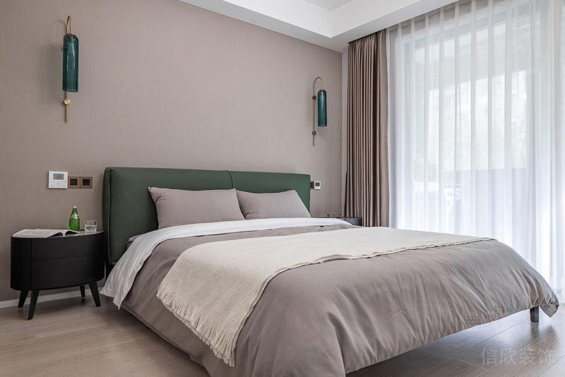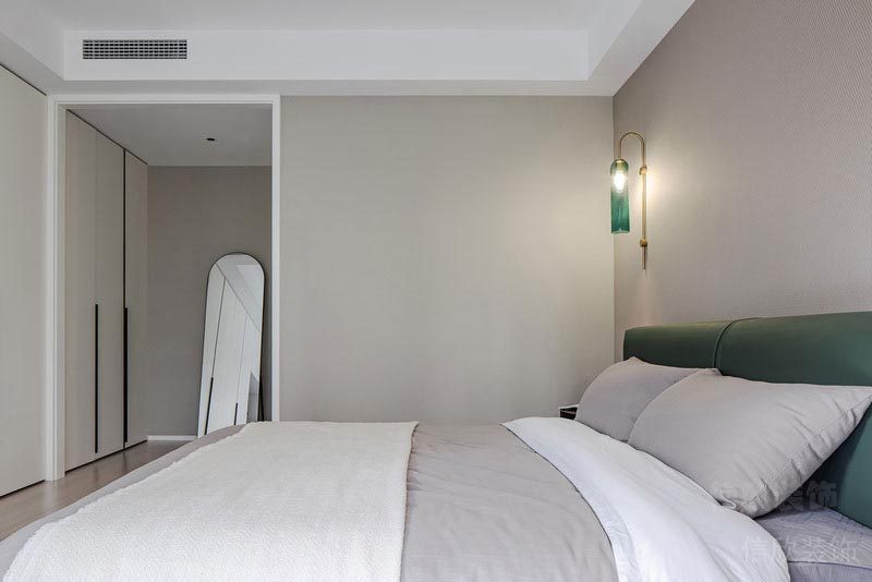 深圳市福田區綠景紅樹灣壹號次臥 次臥室采用了一體式的白色衣柜和灰色寫字桌混搭,簡單的淺灰壁紙和米色的床頭背景墻壁紙相區分,適合的布藝床,體現出現代簡約風中,簡單,低調,實用性極強的特點。