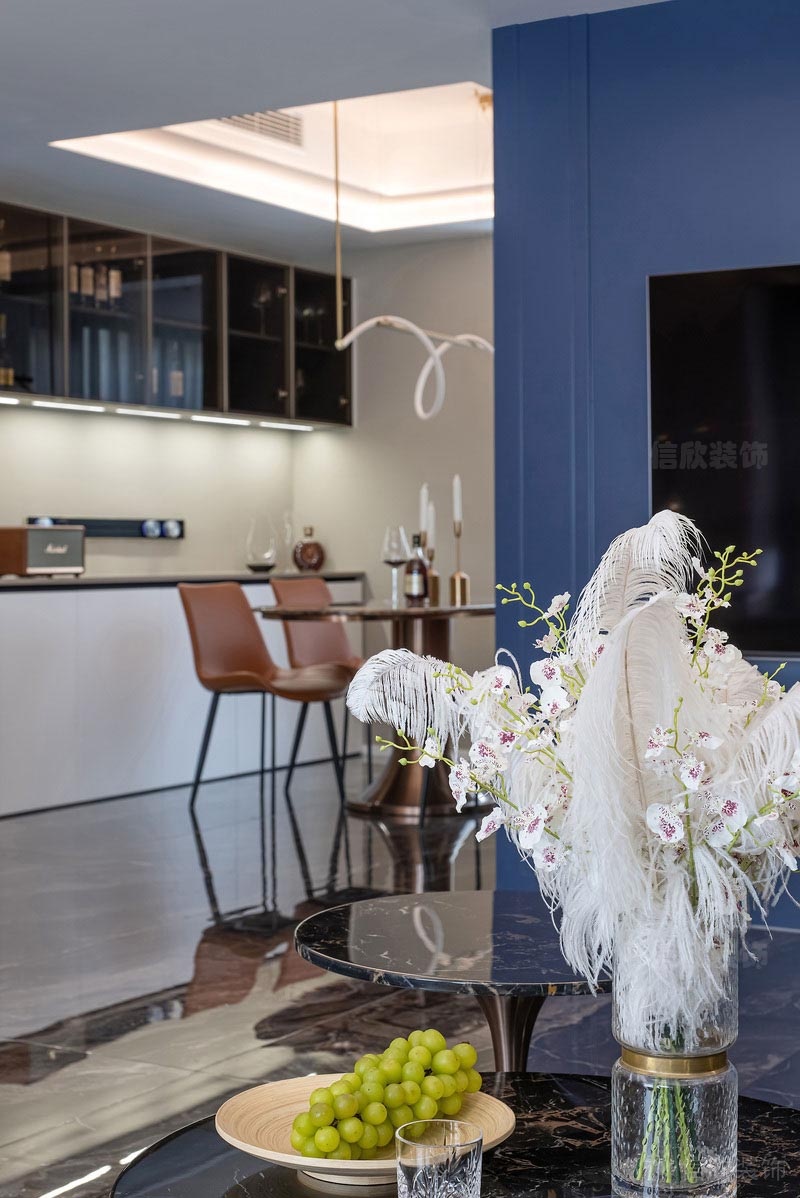 深圳市福田區綠景紅樹灣壹號客廳 客廳藍色的背景墻,三角形帶量的吊頂,深咖色石紋地磚,專屬于貴族氣質的天鵝絨布藝沙發;無一不散發出瀟灑又桀驁的歐洲古典貴族氣質。