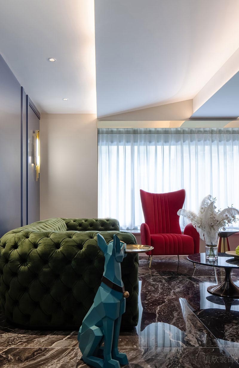 深圳市福田區綠景紅樹灣壹號裝飾 綠色沙發代表著希望,紅色的沙發椅則代表熱情,紅綠搭配的組合;讓人心曠神怡,背景墻藍色的高貴,金色壁燈的貴氣,烘托出整個客廳的浪漫氛圍。