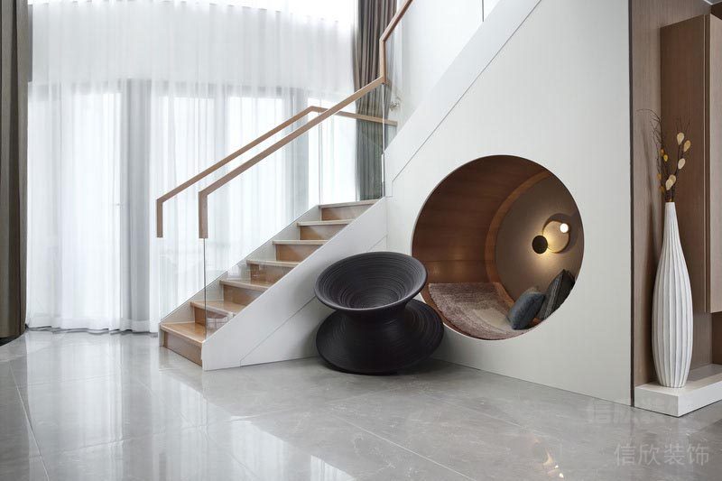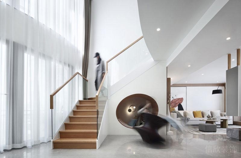 超脫的原木玻璃樓梯,現(xiàn)代感的水晶玻璃吊燈,簡單而脫俗。