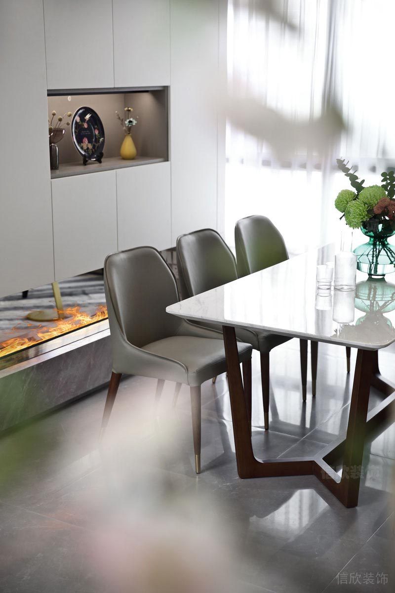 隔墻式的電視背景墻,灰色的石臺,白色的基體,熊熊燃燒的壁爐,勾勒出一副北歐式的浪漫畫卷。