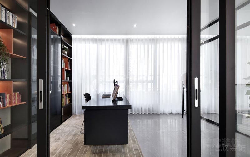黑色的書柜,現(xiàn)代的書桌,白色的窗簾,黑白搭配這個永不過時的話題,讓您的書房簡約而不簡單。