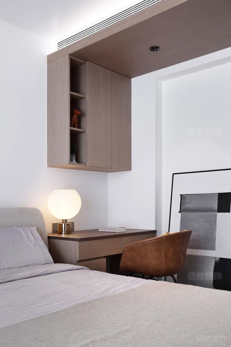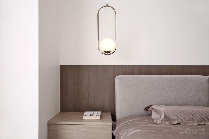 壁紙和木紋結(jié)合的背景墻,干凈,清爽的床單,現(xiàn)代感十足的吊燈,色調(diào)冷而溫馨,家飾簡而時尚。