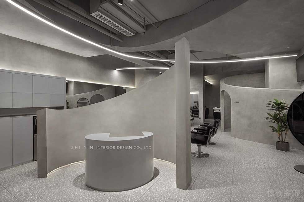 洗頭區和造型區的區域分隔設計,有效的規劃了空間使用的合理性,灰色的空間造型,體現了原始工業感的簡潔與干練唯美的特性,讓顧客能夠更好的舒緩情緒,放松心情。