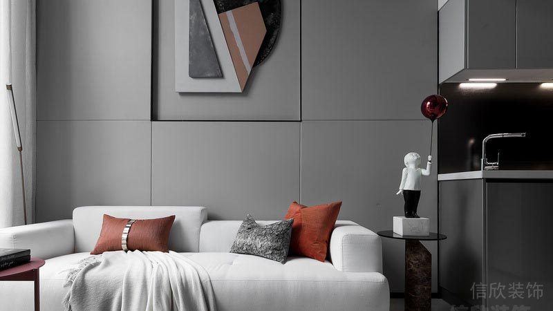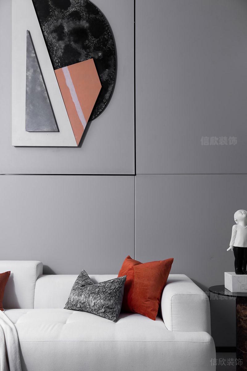 灰色的硬包,淺灰的地面,白色的沙發,表現出后現代簡約輕快而不繁雜的生活方式,一副抽象的背景掛畫,點綴小眾化的審美情趣。