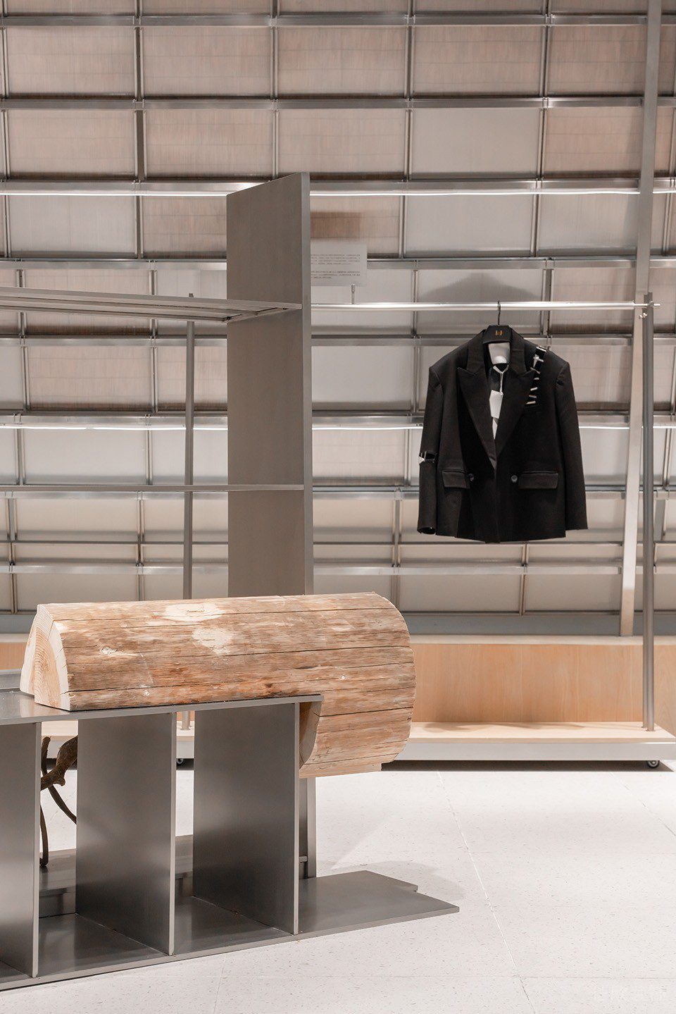 原木風服裝店大廳,金屬展架和原木的結合,衣服掛上去不僅亮眼,也更符合綠色,自然,環保的理念。