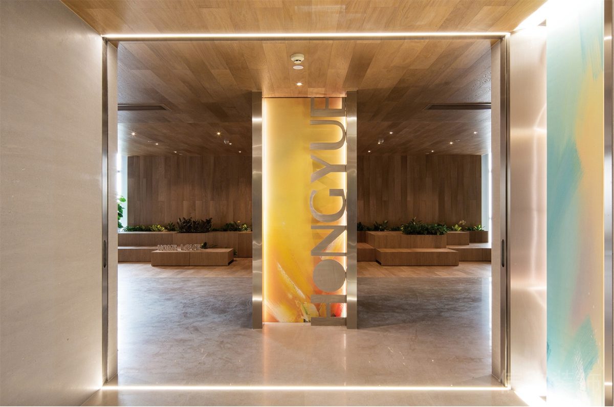 12根線型燈飾排成陣列,在不同視角下,交織出不同形狀的幾何光影,與創(chuàng)意拼合的接待臺(tái)構(gòu)就豐富的層次感。