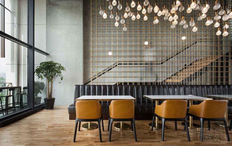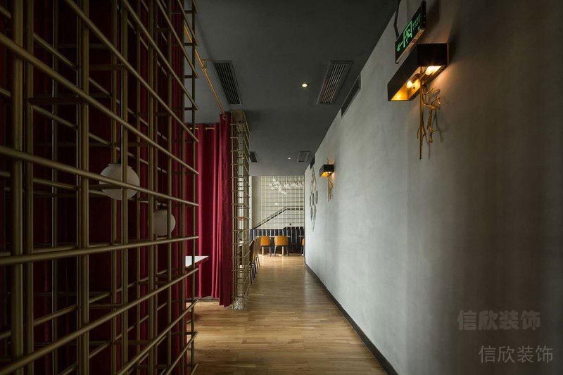 大量簡約工業元素的應用,精致的工業吊燈,鐵藝的隔墻,酒瓶做成的背景墻,打造出的簡潔,明快,深入人心的主題;讓客人進入就有眼前的一亮的潮流感。