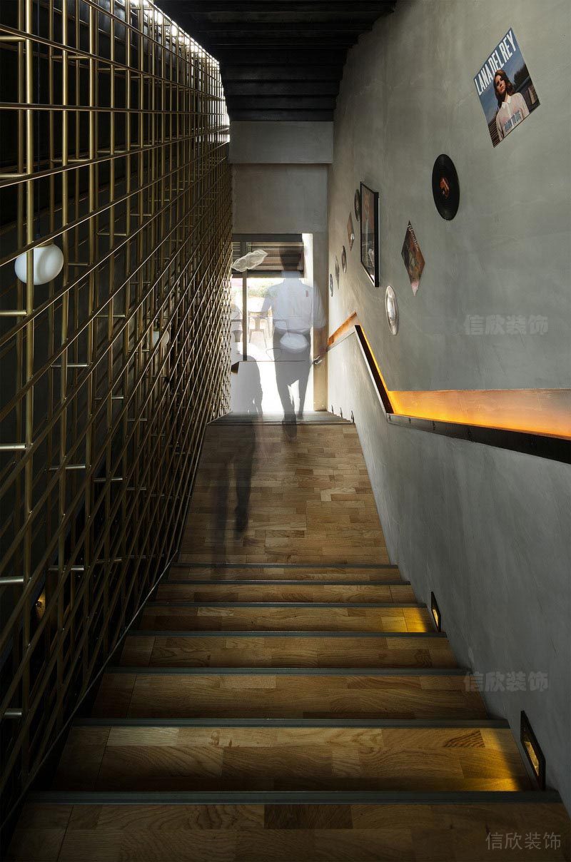 暖黃木紋的樓梯,和金屬鐵藝的隔墻,視覺沖擊感強烈,但多了一份溫馨的氣息。