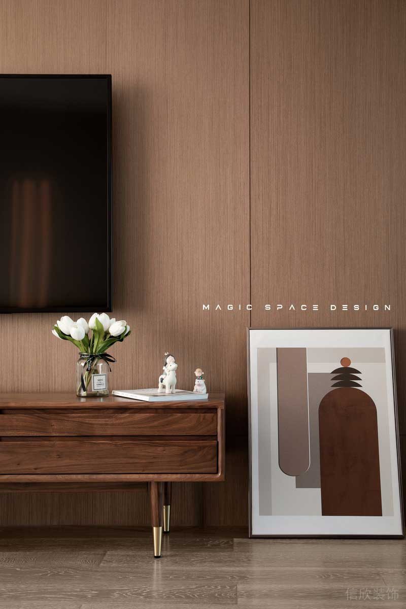 ?深圳龍崗布吉北歐簡約風舊房翻新改造裝修的客廳空間原木色的基調為主,木紋板構成的背景板。
