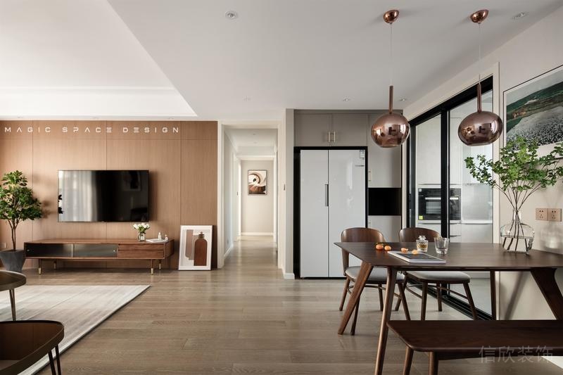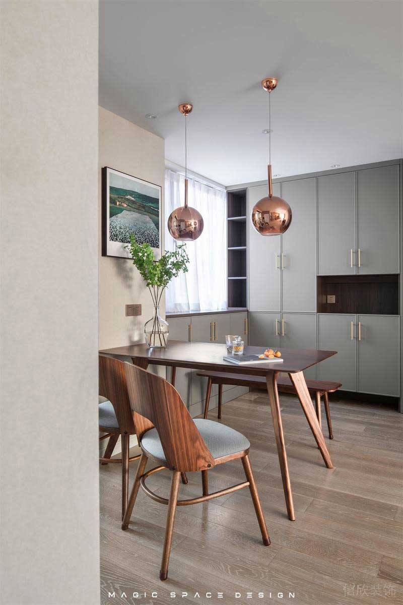 ?深圳龍崗布吉北歐簡約風舊房翻新改造裝修,設計師有意強化區域的結構和色彩,通過一組金屬色的吊燈恰到好處的將虛實關系勾勒出來。