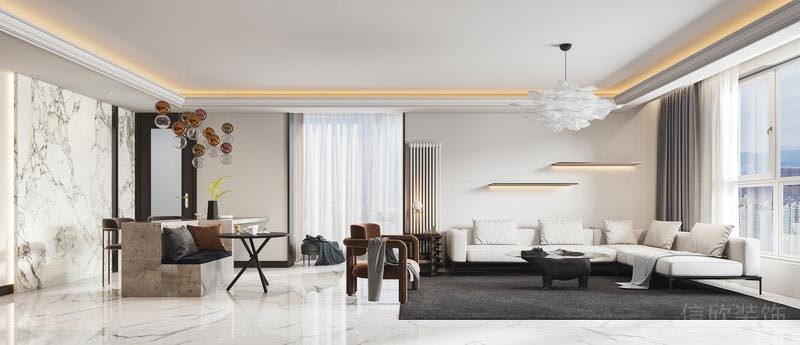 沙發背景墻選擇留白,這樣可以為屋主擺放一些自己的收藏品創造了空間。餐廳區域原本狹小單調,在這面墻用了一塊大理石來裝飾墻面,和燈光的搭配下,會讓你感覺這里很有深意。