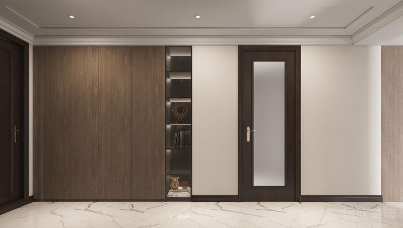從客廳進入到臥室需要經過一個狹長的過道,這個區域剛好有一個方儲物柜的位置,為了避免單調和封閉,柜子做了半開放和發光,這樣這里還可以擺放物件,增加趣味。