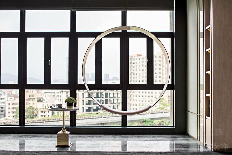 黑色和黃色的地板,把空間做了一個(gè)美觀而無違和感的分隔,抽象風(fēng)的立體裝飾物,給人留下無限的遐想。