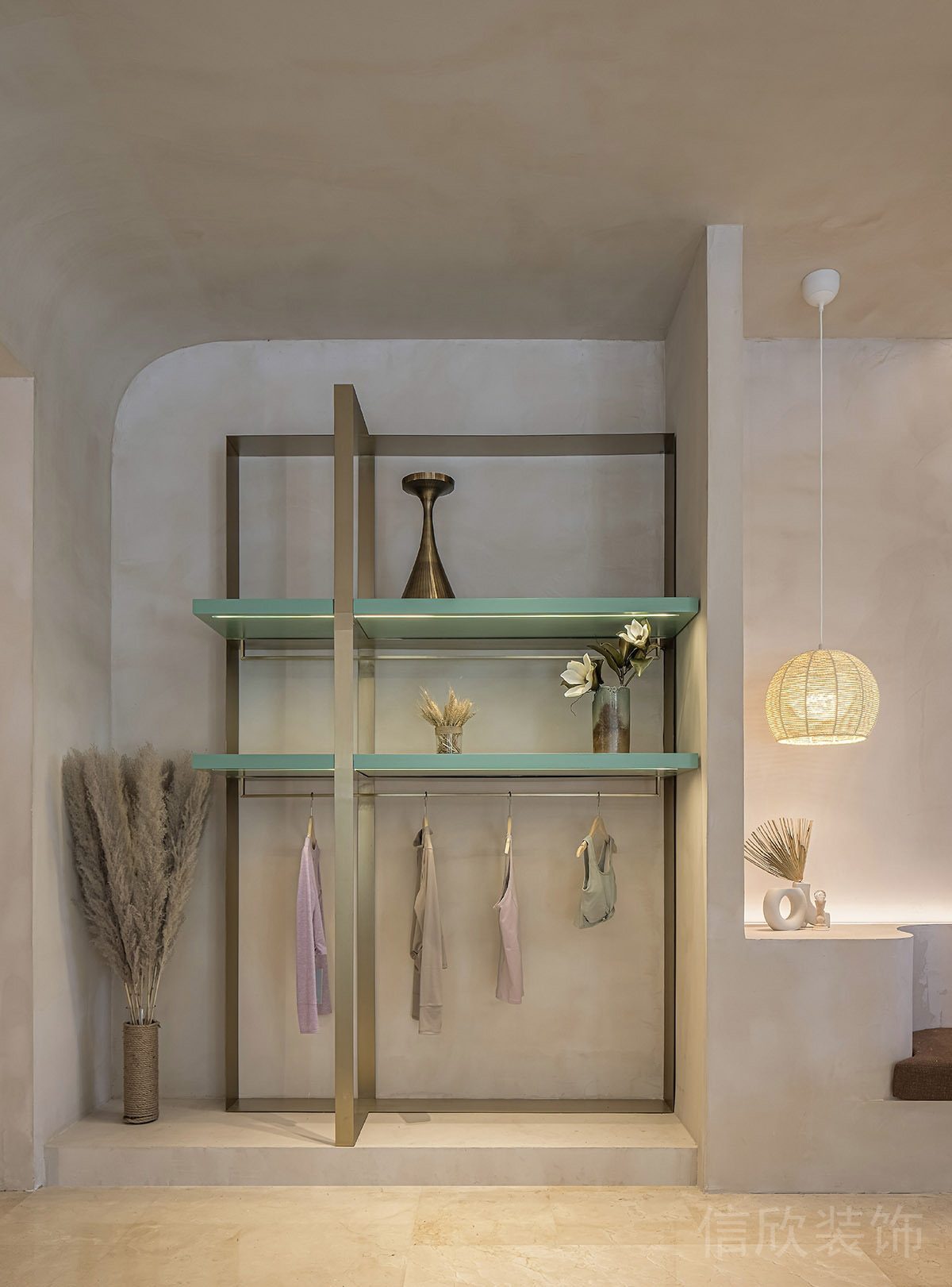 白色墻面作為主色調,墻體設計適合放置瑜伽用具的儲物架和鏤空柜子,增加空間的時尚感和活力。