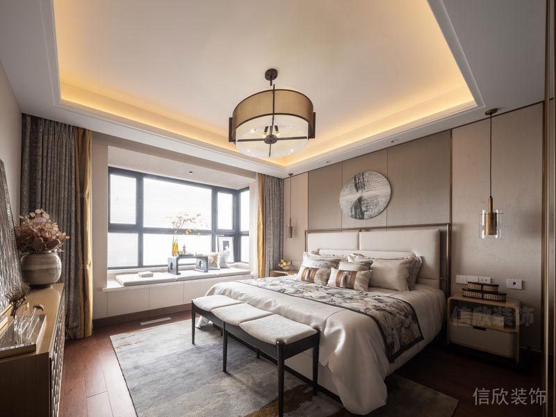 典雅的硬包背景墻,中式韻味的山水畫裝飾,現(xiàn)代的素色皮藝暖床,時(shí)尚貴氣的吊燈;讓您在睡夢(mèng)中也能感受到濃烈的中華五千年文化所帶來的厚重沉淀感。