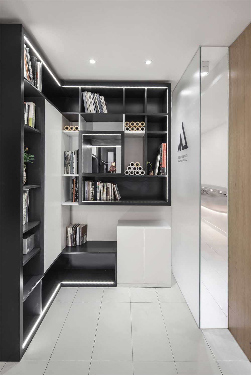 設計工作室門頭,黑白兩色長方形地磚的斜切增加空間感,透明玻璃門和原木色的柱子包邊。