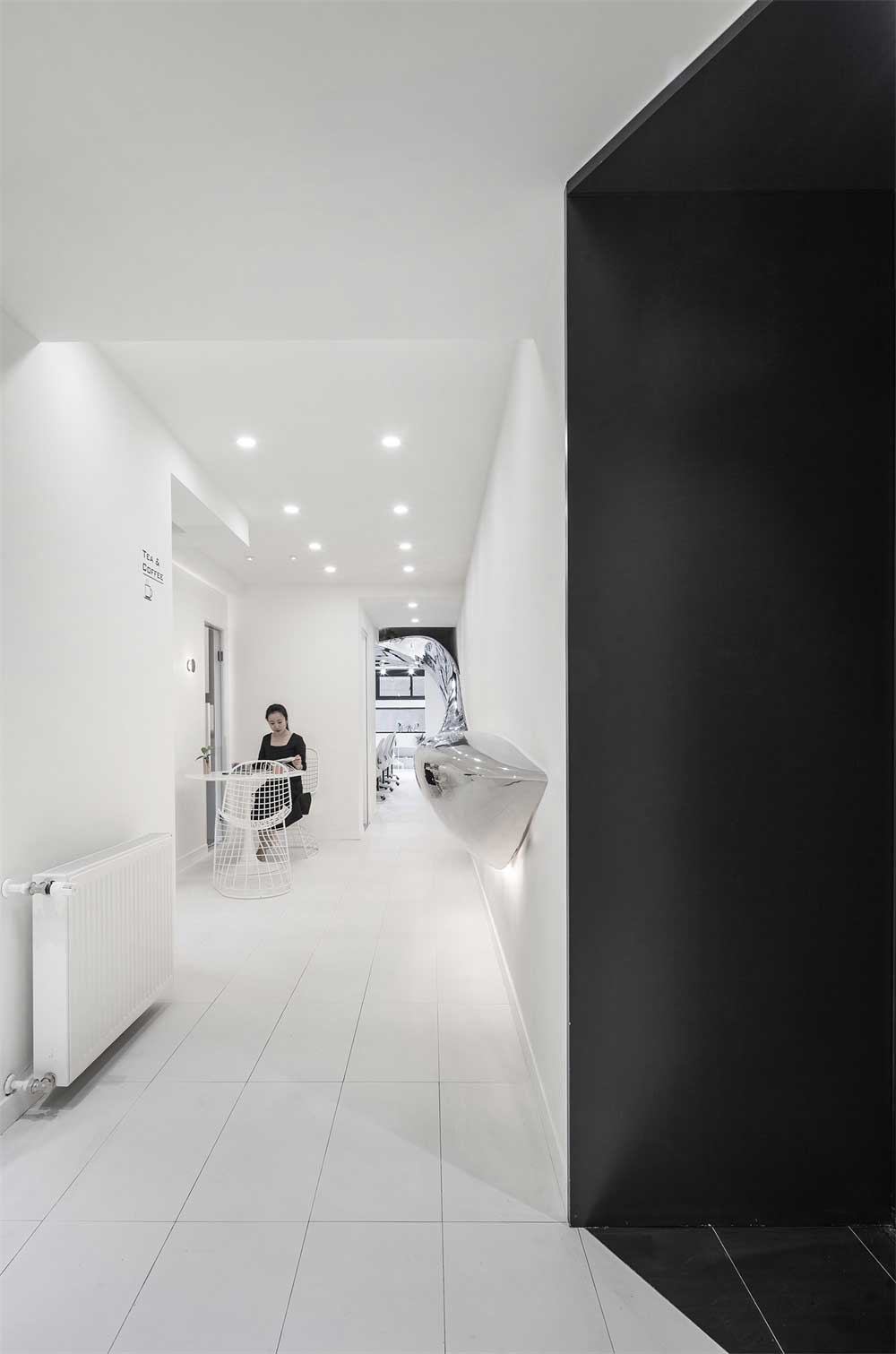 設計理念:本案是一所創意型風格的設計工作室裝修設計案例,設計工作室本身就和新穎,創意,想象力這些詞聯系在一起,工作室本身就是通過獨到的設計,和天馬行空的想象,以及結合客戶實際的需求,創作出能深入客戶心里的作品,來打動客戶。因此在自身工作室的裝修上,對于美感,理念以及設計感的要求便十分的高;因為這關系到工作室給客戶的第一印象。本案以后現代風的黑白灰三色以主色調,結合現代簡約風,簡潔,大方,新奇的理念,盡可能的打造出一副美觀的視覺盛宴。入戶的位置通過頂面和地面,黑白兩色的裁剪三角形的分隔,來擴大門廳的面積感,入戶的位置設有咖啡吧臺,頂面采取了簡單的平頂,通過外擴式燈槽增加素雅的感覺,銀色的藝術管道設計,一直延伸到工作區,通過暗線指引的手法,給人制造出水流流動的美感。之后內部設有寬敞的洽談區,方便通過影響的方式,讓客戶更直觀的了解方案的效果,陽光玻璃房的設計,在室內就能享受陽光傾瀉的暖意,光影折間,猶如鉆石版璀璨的工作環境。