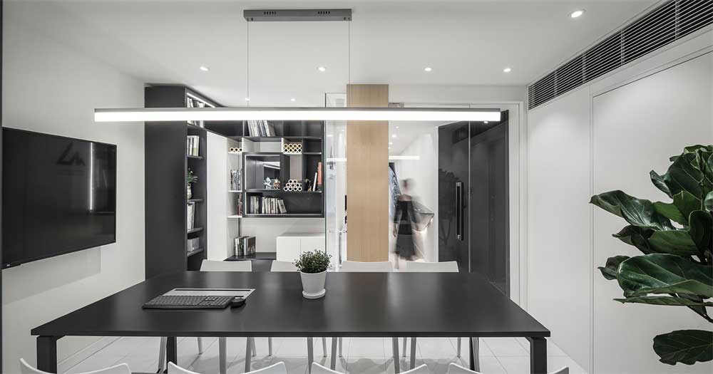 黑色的長型洽談桌,白色的椅子,中間LED屏幕,邊洽談邊和客戶講解,更能直觀的表現方案的魅力。