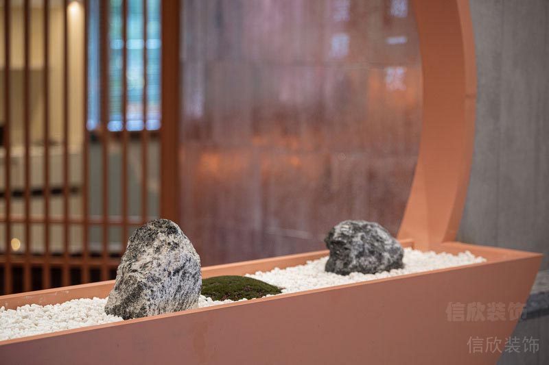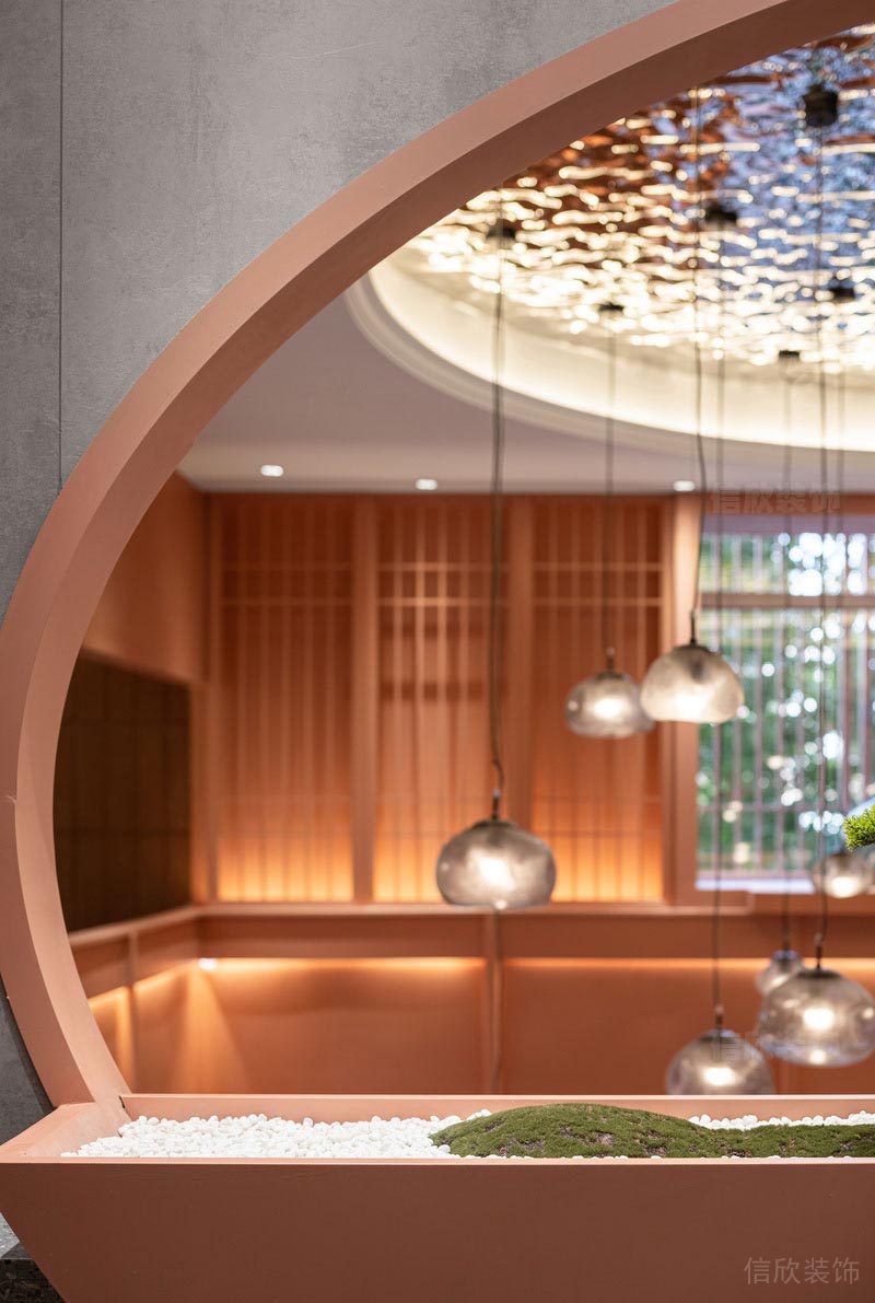 墻面上開了圓孔的隔墻,暗合天圓地方之意,開闊了視野,可以把陽光引進來,枯山水的綠植用餐之余,也是一道養眼的綠意。