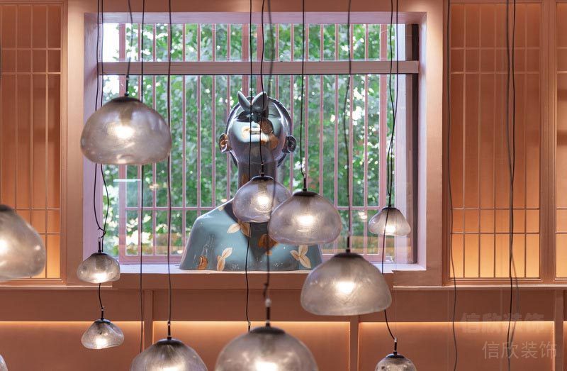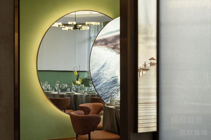 明月般的墻飾,鏡子和風景畫的結合,似乎告訴人們,人有悲歡離合,月有陰晴圓缺,此事古難全,活在當下,珍惜此時此刻的相聚時光。