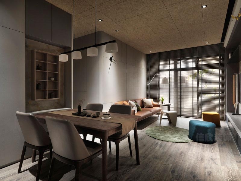 深圳市龍崗區新霖薈邑餐廳 客餐廳一體式 的設計,原木紋 的餐桌,燈光照耀下的壁龕,既是裝飾,又充滿了北歐般的節約浪漫情懷。