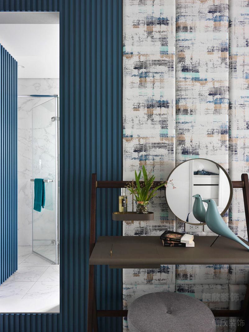 深圳市龍崗區新霖薈邑主臥 藍色調的現代簡約臥室,抽象畫的背景,天鵝絨的軟床,如夢幻一般的璀璨。