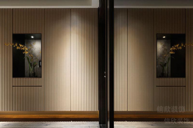 深圳市龍崗區新霖薈邑電視背景 木藝邊框加抽象的壁紙,中間打上燈帶,隔板把上下空間一分為二,深邃而看見十足。