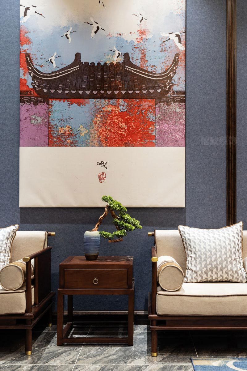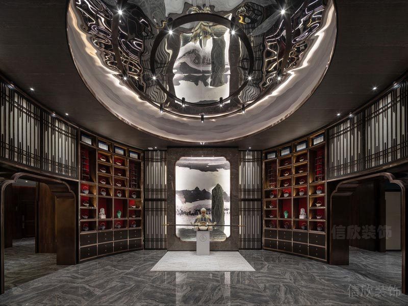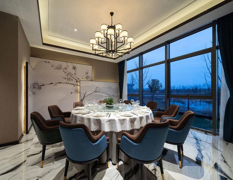 深圳市龍華區中餐廳大包房 四方開闊的穹頂,春花秋月般柔美的壁紙,山水畫在藍色背景的裝點下,只露出圓形的一角,在暖光的點綴下,如一輪初升的明月。