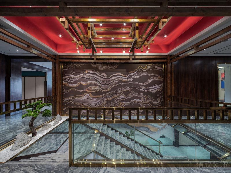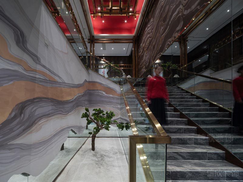 深圳市龍華區中餐廳樓梯 天然石紋的樓梯,含蓄而深沉,古董瓷器的展柜,在耀眼燈光的照射下,駐足欣賞,品味瓷器身上那流傳千年的故事。