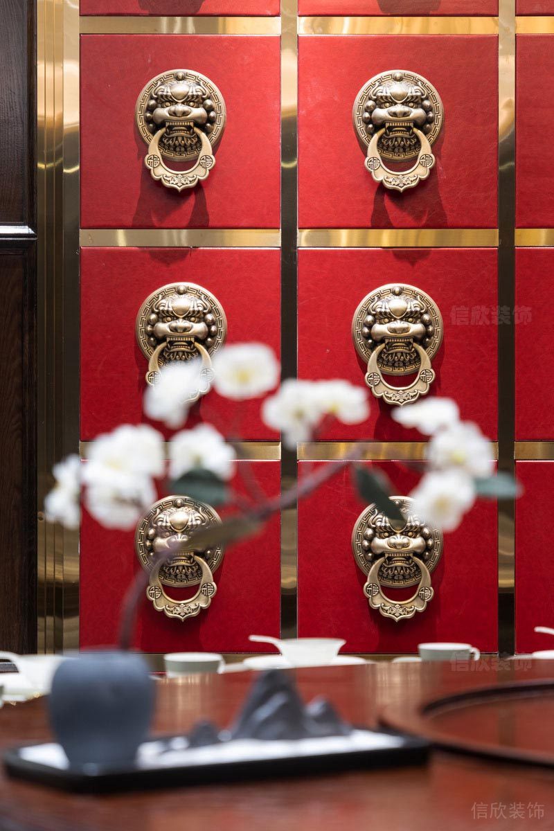 深圳市龍華區中餐廳小包房 云霞般柔美的藍色地毯,古風濃厚的紅色背景墻,配上中國特色的獅子頭門釘,配上黃色的山水畫,讓人驀然有種明月出天山,蒼茫云海間的蒼涼之感。