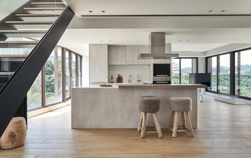 開放式設(shè)計(jì)的廚房,使生活看起來極為的隨心,富有生命氣息的原木式餐桌,是對生活極度的熱愛;;三盞工業(yè)風(fēng)北歐吊燈,為您增加生活的調(diào)味劑。