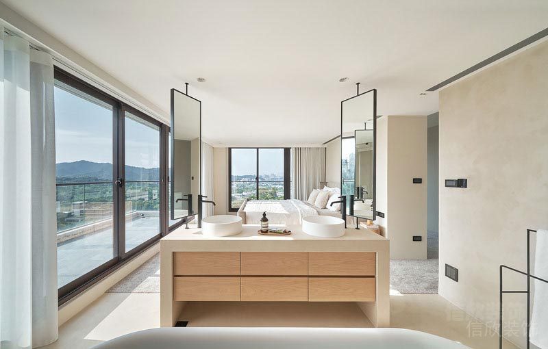 整體以黃色調(diào)作為色彩的主題,現(xiàn)代的玻璃隔斷和鋼窗作為點(diǎn)綴,低飽和度的通透和明亮感強(qiáng),溫馨而舒適的浴缸,極簡單極奢華的生活享受。
