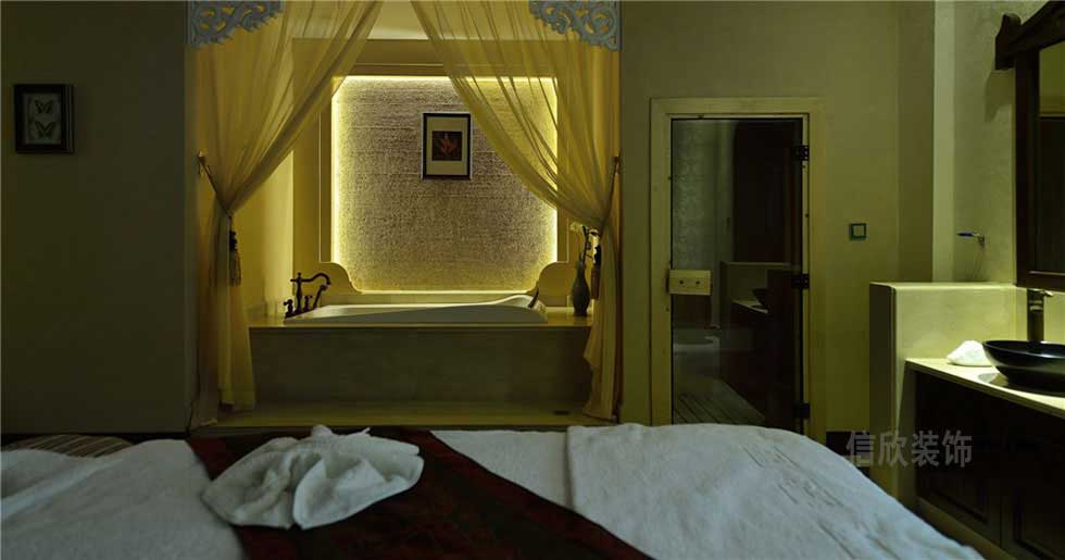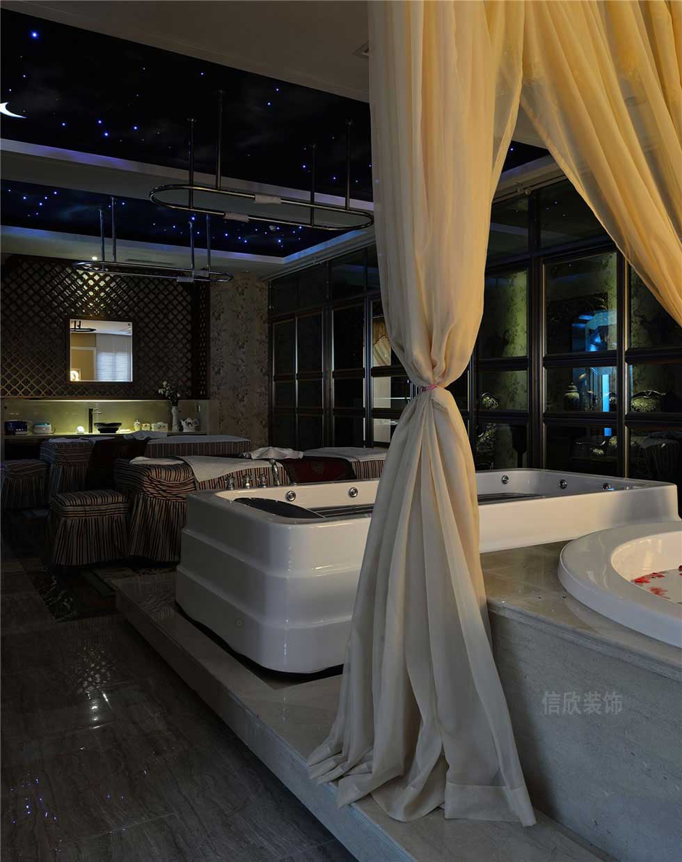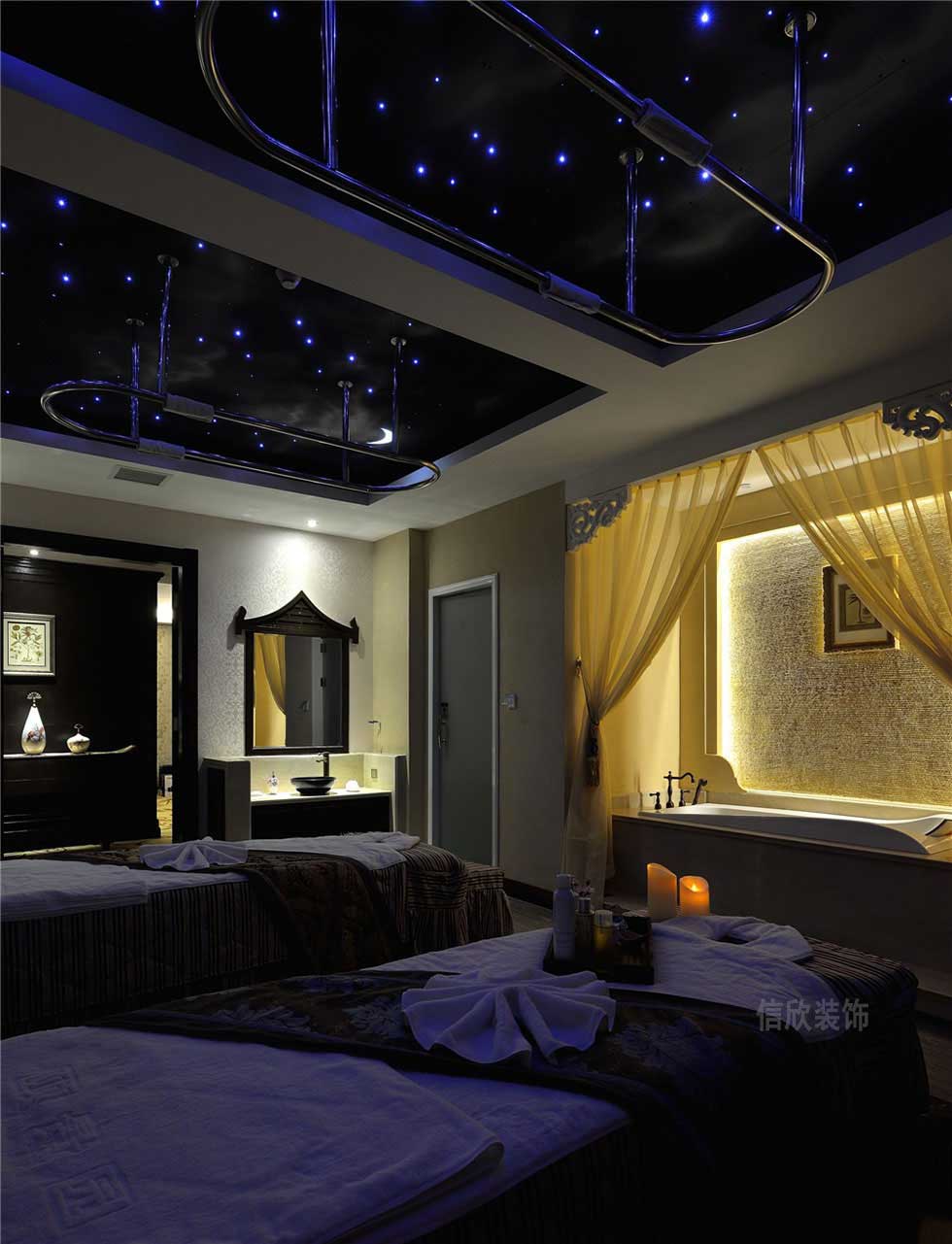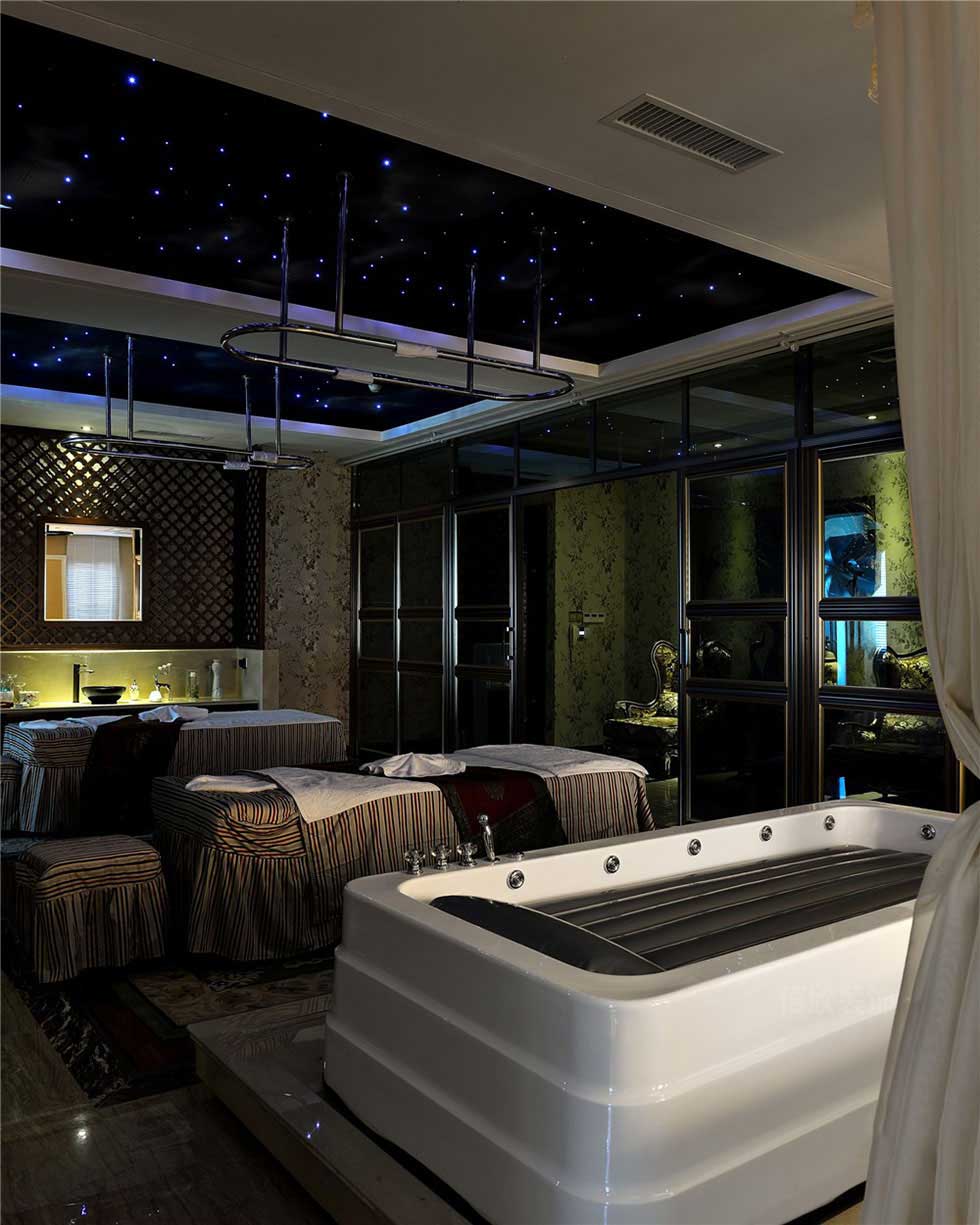 通過光影效果的變化,讓整個房間的燈光略顯昏暗,同時也更具溫馨之感,室內窗簾的應用把沐浴間和按摩間,不經意間做了功能性區分,星空頂讓人一抬頭就能看見繁星點點,給人無限遐想。